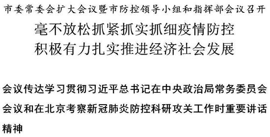 3月5日下午,市委常委会扩大会议暨市防控领导小组和指挥部会议召开,传达学习贯彻习近平总书记在中央政治局常务委员会会议和在北京考察新冠肺炎防控科研攻关工作时重要讲话精神。市委书记、市防控领导小组组长李鸿忠主持并讲话,市委副书记、市长、市防控指挥部总指挥张国清,市人大常委会主任段春华,市政协主席盛茂林,市委副书记阴和俊出席。
