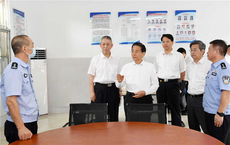 中央政法委秘书长陈一新,广西壮族自治区党委书记、自治区人大常委会主任鹿心社,广西壮族自治区党委副书记、自治区主席陈武,中央政法委副秘书长雷东生,广西壮族自治区党委常委、政法委书记曾欣等分别参加调研。