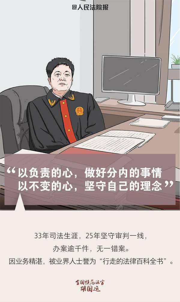 通知指出,胡国运同志生前系江西省高级人民法院二级高级法官,2020年5月6日在工作岗位上突发疾病,因公殉职。胡国运同志参加法院工作33年来,始终以高度的事业心、强烈的责任感、饱满的工作热情和忘我的精神状态,全身心投入工作,在法官教育培训、民商事审判、环境资源审判、涉网络侵权审判方面作出重要贡献,是全国政法系统深入学习贯彻习近平新时代中国特色社会主义思想、践行社会主义核心价值观和党的群众路线的优秀代表,是牢记使命、恪尽职守和为人民司法事业鞠躬尽瘁、死而后已的先进典型。