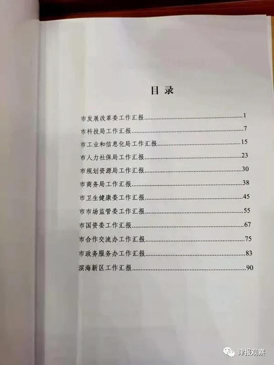 今年的企业家大会,第一个环节就叫“向企业家汇报”,除了市级领导同志介绍天津经济发展详细情况外,每个企业家桌上都有一本《向企业家汇报》的册子,汇集了11个市直部门和滨海新区今年的“工作汇报”。