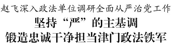 在调研交流中,赵飞悉心倾听、认真记录,详细询问具体情况,对于大家提出的好思路、好方法、好建议,表示充分的肯定和感谢。赵飞指出,党的十八大以来,以习近平同志为核心的党中央推动新时代全面从严治党,取得历史性、开创性成就,产生全方位、深层次影响。他强调,政法机关是党和人民的“刀把子”,政治属性是第一属性,要保持高站位,增强责任感、紧迫感,牢牢压实全面从严治党主体责任。要敢于动真格,坚持目标导向、问题导向、效果导向,发扬自我革命的斗争精神,勇于刀刃向内、刮骨疗毒。要务必求实效,盯住问题不放,剖析病灶根源,做到问题清楚更要清除,全力锻造绝对忠诚、绝对纯洁、绝对可靠的政法队伍,在新发展阶段、新发展格局中展现津门政法铁军良好形象。