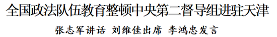 张志军强调,查纠整改是教育整顿动真碰硬、触及要害、务求实效的中心环节,问题查纠深不深入、整改彻不彻底,直接决定着教育整顿的成效。中央督导组在这个重要时间节点进驻,就是要抓住关键环节开展督导。天津市要对标对表党中央决策部署,从宏观上明确目标、找准方向、把好节奏、有序推进。做好教育整顿督导工作是督导组和天津市委共同的政治责任。督导组将与市政法队伍教育整顿领导小组密切配合、整体联动、形成合力,通过共同努力,切实把总书记的重要指示要求领会好、贯彻好,把党中央的决策部署落实好、执行好,推动教育整顿持续深入、取得实效。