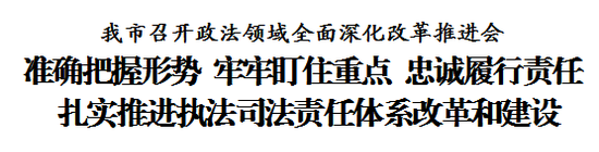 8月5日上午,我市召开政法领域全面深化改革推进会,深入贯彻落实习近平法治思想和习近平总书记“七一”重要讲话精神,传达贯彻全国政法领域全面深化改革推进会精神和市委常委会会议要求,研究部署加快推进执法司法责任体系改革和建设工作。市委常委、市委政法委书记赵飞出席会议并讲话。副市长、市公安局局长董家禄主持会议,市高级人民法院院长李静、市人民检察院检察长宫鸣出席。