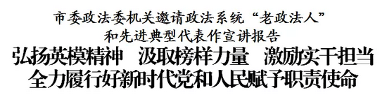 8月24日下午,市委政法委机关举办“老政法人”和政法系统先进典型代表事迹宣讲报告会,邀请市公安局“老公安宣讲团”成员于建文、滨海新区人民法院北塘中关村科技园中心法庭庭长包津燕、市人民检察院第二分院四级高级检察官曹纪元、市滨海监狱医院院长于军红、市公安局刑事侦查总队七支队副支队长孙冀5名同志,给全体党员干部作宣讲报告。市委常委、市委政法委书记赵飞参加并讲话,市委政法委分管日常工作的副书记张亮主持。