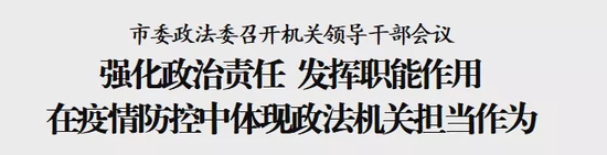 会议要求,政法机关要认真贯彻中央政法工作会议精神,巩固政法队伍教育整顿工作成效,切实履行职能作用,坚决打击各类违法犯罪活动,严查各种危害疫情防控的违法行为,及时发现化解处置因疫情引发的各类社会矛盾纠纷,严防因疫情可能引发的极端个人案事件的发生,全力维护政治安全和社会大局稳定。要加强对政法单位参加疫情防控工作的指导,健全完善各类工作预案,确保中央和市委指令落实到位。要讲党性、顾大局,积极响应市委号召,抽调政法机关干部充实到社区一线,筑牢社区疫情防控的堡垒。要做好政法单位自身疫情防控,严格遵守疫情防控有关规定,严密办案单位和监管场所疫情防控措施,确保绝对安全。要及时发现冲在一线、担当作为的先进典型,充分运用主流媒体和政法自媒体,加大依法防控工作成效和感人事迹的正面宣传。要加强督导检查,强化责任落实,对无所作为、工作不力的,要严肃追责问责。