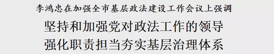 李鸿忠在讲话中说,党委政法委是党委领导和管理政法工作的职能部门,是实现党对政法工作领导的重要组织形式。区委政法委作为代表区委行使政法工作领导权的政治机关,要以强烈的责任担当把党对政法工作的全面领导、绝对领导落到实处,牢记天津之“特”、天津之“卫”的职责使命,把维护政治安全作为首要,以实际行动坚决筑牢首都政治“护城河”。