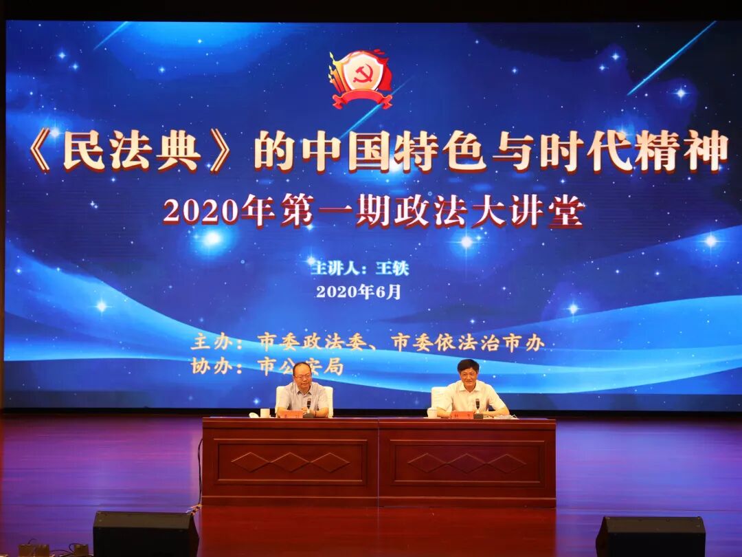 6月15日,市委政法委、市委依法治市办联合举办政法大讲堂。著名民法学家,民法典起草者之一,中国人民大学法学院党委书记、院长王轶,以“民法典的中国特色和时代精神”为主题作专题讲座。市委常委、市委政法委书记、市委依法治市办主任赵飞主持,市委政法委副书记、委员,市委依法治市办各成员单位和市政法各单位有关领导同志180余人在市公安局报告厅主会场,市、区两级政法部门1万余名政法干警在近200个分会场,共同听取专题讲座。