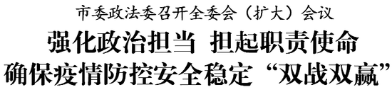 会议指出,习近平总书记关于疫情防控系列重要讲话重要指示,总揽全局、内涵丰富,为我们提供了根本遵循和科学指引,注入了强大的政治动力和精神动力。全市政法机关要把疫情防控作为当前最重要的工作,提高政治站位,强化政治担当,增强“四个意识”,坚定“四个自信”,做到“两个维护”,不断巩固扩展主题教育成果,坚持把人民群众生命安全和身体健康放在第一位,发扬斗争精神,持续加力、连续作战,坚决打赢疫情防控人民战争、总体战、阻击战。会议强调,全市政法机关要充分发挥职能作用,以最大的决心信心、最实的工作举措、最严的标准要求,谋划好、组织好、落实好疫情防控期间安全稳定工作,确保疫情防控和安全稳定“双战双赢”。