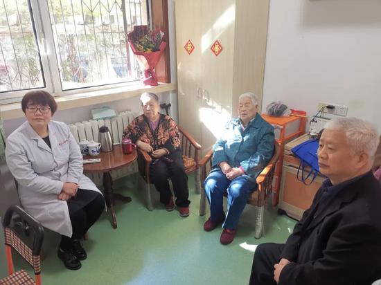▲和平区晟世第三养老院里,87岁高龄的“抗美援朝女英雄”吴炯(左二)正在观看纪念大会,她是电影《上甘岭》女卫生员王兰的原型之一。