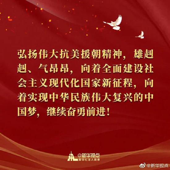 回望70年前伟大的抗美援朝战争,进行具有许多新的历史特点的伟大斗争,瞻望中华民族伟大复兴的光明前景,我们无比坚定、无比自信。让我们更加紧密地团结在党中央周围,弘扬伟大抗美援朝精神,雄赳赳、气昂昂,向着全面建设社会主义现代化国家新征程,向着实现中华民族伟大复兴的中国梦,继续奋勇前进!