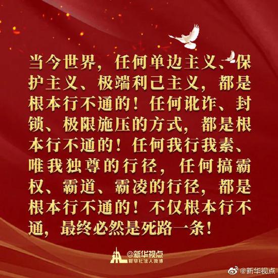 世界是各国人民的世界,世界面临的困难和挑战需要各国人民同舟共济、携手应对,和平发展、合作共赢才是人间正道。当今世界,任何单边主义、保护主义、极端利己主义,都是根本行不通的!任何讹诈、封锁、极限施压的方式,都是根本行不通的!任何我行我素、唯我独尊的行径,任何搞霸权、霸道、霸凌的行径,都是根本行不通的!不仅根本行不通,最终必然是死路一条!