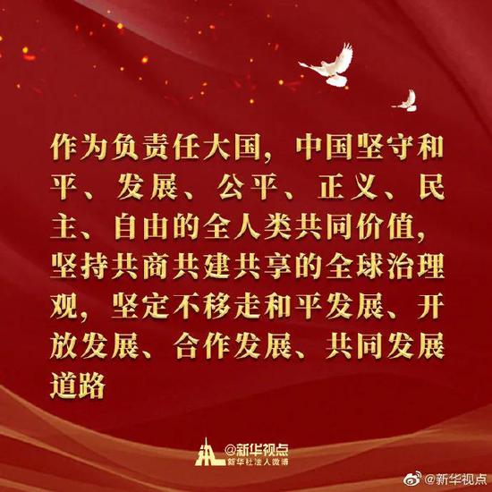 ——铭记伟大胜利,推进伟大事业,必须维护世界和平和正义,推动构建人类命运共同体。中华民族历来秉持“亲仁善邻”的理念。作为负责任大国,中国坚守和平、发展、公平、正义、民主、自由的全人类共同价值,坚持共商共建共享的全球治理观,坚定不移走和平发展、开放发展、合作发展、共同发展道路。只要坚持走和平发展道路,同各国人民一道推动构建人类命运共同体,就一定能够迎来人类和平与发展的美好未来!