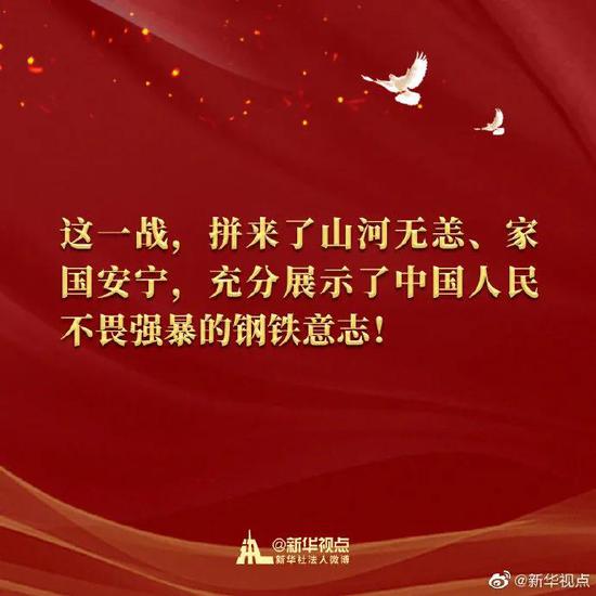 ——无论时代如何发展,我们都要砥砺不畏强暴、反抗强权的民族风骨。70年前,帝国主义侵略者将战火烧到了新中国的家门口。中国人民深知,对待侵略者,就得用他们听得懂的语言同他们对话,这就是以战止战、以武止戈,用胜利赢得和平、赢得尊重。中国人民不惹事也不怕事,在任何困难和风险面前,腿肚子不会抖,腰杆子不会弯,中华民族是吓不倒、压不垮的!
