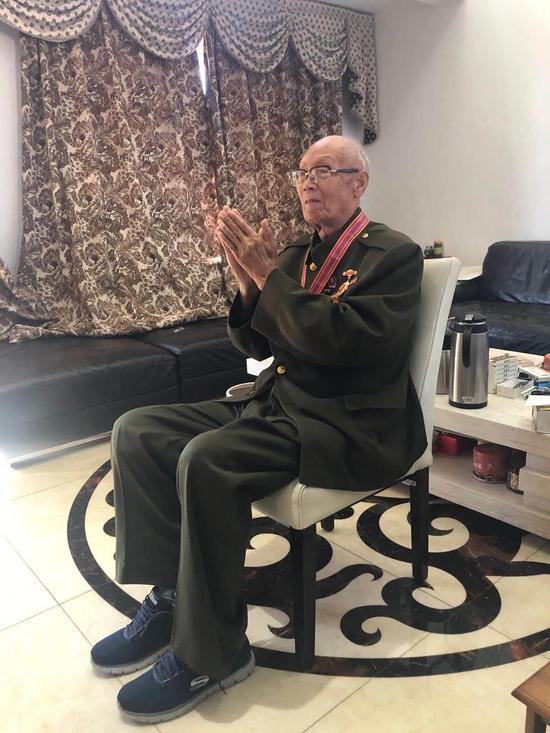 ▲天津警备区河北第二离职干部休养所离休干部,今年91岁的谢荣征家中观看纪念大会。1950年10月15日,谢荣征随部队第一批入朝作战,分别参加了第一、二、三、四次战役。