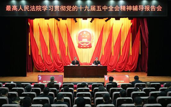 11月12日,最高人民法院举行学习贯彻党的十九届五中全会精神辅导报告会。中央宣讲团成员、中央政法委秘书长陈一新应邀为法院干警作专题辅导,最高人民法院党组书记、院长周强主持报告会。