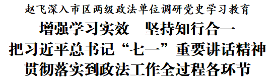 连日来,市委常委、市委政法委书记赵飞分别来到市第二中级人民法院刑一庭、公安南开分局万兴派出所,就深入学习贯彻习近平总书记“七一”重要讲话精神与政法干警代表座谈交流,深入推进党史学习教育,并就如何在日常政法工作中更好地践行为民宗旨,向基层干警求教问计,征求意见建议。