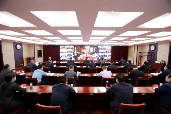 市、区两级政法单位班子成员在主会场和分会场参加视频会议。